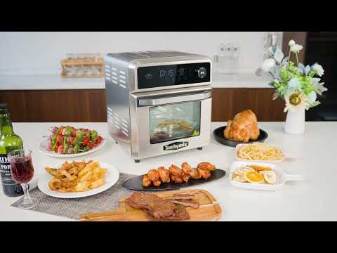 Buchymix Premium Stainless Steel Multifunctional Smart Air Fryer Oven. Description Why settle for less when you can have more? This Buchymix multifunction smart air fryer oven is built with dual heating elements designed to heat faster, evenly and cut your cooking time. It combines the design of an oven with air fryer technology to give you everything you need in the kitchen. Take full control of heating with manual mode that allows you to choose between bottom, top or dual heating. With dual heating and rapid air technology, this air fryer allows you to air fry, grill, sear, dehydrate, roast, toast, bake, and more in one appliance. This air fryer comes with a heavy duty cast aluminum nonstick grill plate featured with one-of-a-kind design to sit right on top of the bottom heating element for faster and even heating, so you can bring the grilling indoors any day of the week. Its nonstick surface makes cleaning up easy and gets rid of the elbow work needed to scrub and scrap residue from a regular outdoor grill. The ultimate air fryer grill’s cooking interior and exterior are built with stainless steel designed to heat up quickly and withstand high cooking temperatures up to 450°F, so you can sit at dinner table faster. Designed to take a permanent spot on your countertop, it features a glass touch control panel and white lit display to look sophisticated and match any kitchen. Check for doneness easily with the interior oven light and the see-through glass door. The heavy-duty glass door is designed with safety hinges designed to allow the user to open the door at 2 levels. At Buchymix, we believe that less is more, the Ultimate Air fryer grill comes with the grill plate and 10 extra accessories, so you can do more with one appliance. It comes with stainless steel silicone-tipped tongs, 2 mesh racks, shallow mesh basket, rotisserie rod and forks, rotisserie cage, rotisserie skewers, and a drip pan. It also features 11 presets, such as grill, broil, fries, chicken, pizza and more along 3 cooking functions, rotisserie, keep warm, and preheat. The new preheat function heats the air fryer grill to the optimal temperature for a desired setting and lets you know when its time to put your food in. It is also designed to go into standby mode as a safety feature if you forget to put your food in. Dehydrate too. The ultimate air fryer grill comes with a dehydrating preset with a temperature range between 90°F to 130°F and up to 8 hours cooking time, so you can make jerky, fruit leather, dried herbs or tasty treats for your furry friends The Ultimate air fryer grill comes with not 1, but 2 recipe books to get you started on exploring all that your new kitchen gadget has to offer. Choose from a variety of meals to make for breakfast, lunch, dinner, or dessert or get started on dehydrating with 20 step by step recipes and a guide on how to dehydrate. Need more inspiration? Buchymix is constantly sharing new video recipes, blogs and seasonal recipe books. We also have a whole community of influencers and everyday users sharing their recipes in social media Customer obsessed and committed to 100% satisfaction